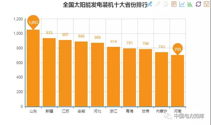 截止2017年底,全國(guó)十大太陽(yáng)能發(fā)電裝機(jī)省份分別是:山東1052萬(wàn)千瓦、新疆933萬(wàn)千瓦、江蘇907萬(wàn)千瓦、安徽888萬(wàn)千瓦、河北868萬(wàn)千瓦、浙江814萬(wàn)千瓦、青海791萬(wàn)千瓦、甘肅786萬(wàn)千瓦、內(nèi)蒙古743萬(wàn)千瓦、河南703萬(wàn)千瓦。