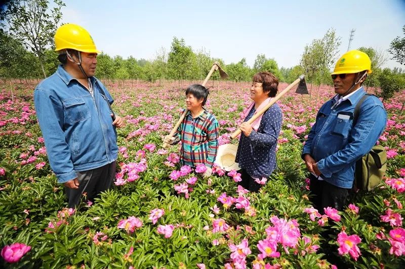 安徽宿州蕭縣供電公司紅廟供電所員工在王寨鎮(zhèn)郝洼村翊博扶貧合作社芍藥園向管理人員了解用電需求。(李令響)