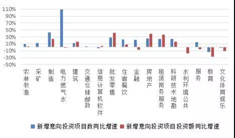 圖3 各行業(yè)新增意向投資項(xiàng)目數(shù)、投資額同比增長情況