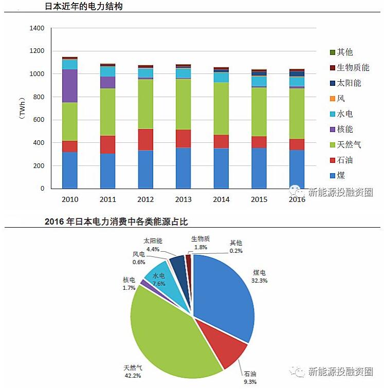 為了彌補核電的空缺,日本火電(包括天然氣和煤電)發(fā)電量占比明顯提升。與此同時,光伏也得到大力發(fā)展,得益于2012年7月啟動的固定上網(wǎng)電價政策,日本光伏裝機迅猛增長,發(fā)電量占比迅速提升,2016年光伏發(fā)電量占比約4.4%。
