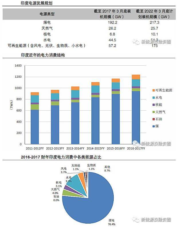 根據(jù)印度中央電力管理局2018年發(fā)布的《國家電力規(guī)劃(Volume1,Generation)》,印度將加快發(fā)展可再生能源,未來五年主要的新增電源為可再生能源,計劃到2022年將可再生能源裝機提升至175GW(其中太陽能100GW,風(fēng)電60GW)。