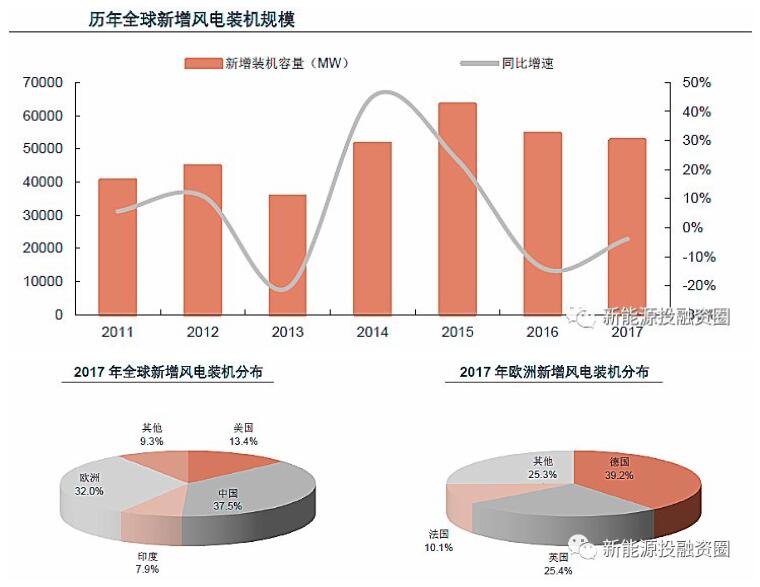 全球風(fēng)電市場近年呈現(xiàn)震蕩發(fā)展格局,2015年達到高點后,近兩年新增裝機有所下滑,根據(jù)全球風(fēng)能理事會的統(tǒng)計,2017年全球新增風(fēng)電裝機52.5GW,同比下滑約4%。
