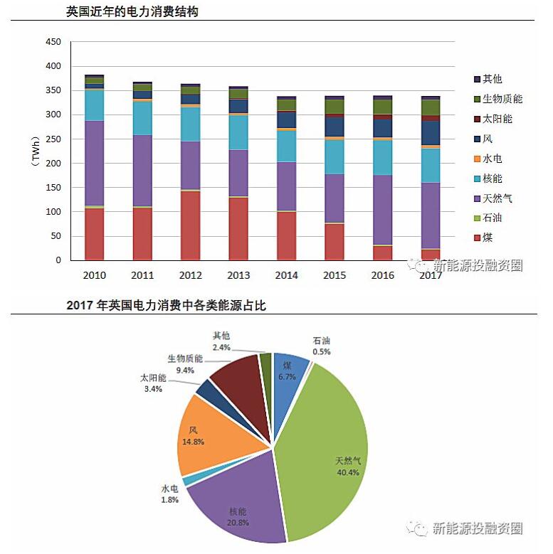 近年英國電力需求呈現(xiàn)小幅下滑的趨勢,其電力結(jié)構(gòu)最顯著的變化是煤電占比的大幅下降以及可再生能源電量占比的快速上升。具體來看,煤電發(fā)電量占比從2010年的28.2%下降至2017年的6.7%,風(fēng)電、光伏、生物質(zhì)三大類可再生能源合計的發(fā)電量占比則從2010年的5.9%提升至2017年的27.6%。