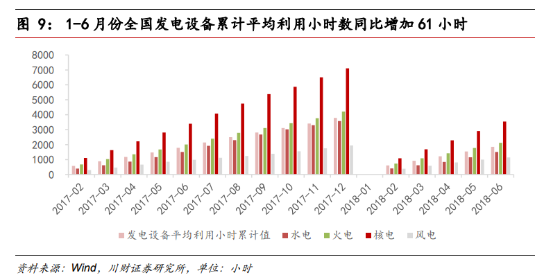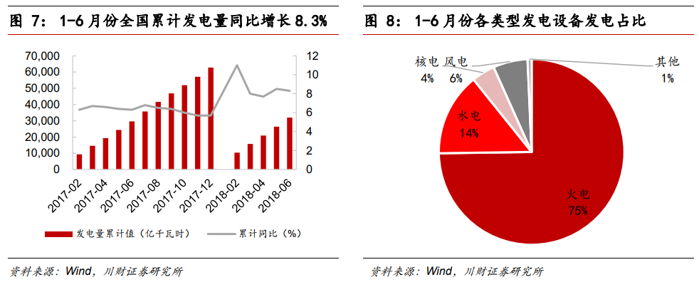 發(fā)電量方面:2018 年 1-6 月份,全國規(guī)模以上電廠發(fā)電量 31945 億千瓦時,同比增長 8.3%,增速比上年同期提高 2.0 個百分點;火電發(fā)電量 23887 億千瓦時,同比增長 8.0%,增速比上年同期提高 0.9 個百分點;水電發(fā)電量 4618 億千瓦時,同比增長 2.9%,增速比上年同期提高 7.1 個百分點;核電發(fā)電量 1300 億千瓦時,同比增長 12.7%,增速比上年同期回落 6.9 個百分點;風電發(fā)電量 1917 億千瓦時,同比增長 28.6%,增速比上年同期提高 7.7 個百分點。受益于用電負荷的增長,全國發(fā)電量保持較快增長,作為最大負荷的火電發(fā)電量增速保持較快增長;今年以來來水情況較去年同期稍好,水電發(fā)電量同比增加。