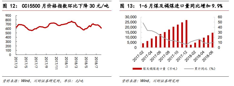 煤炭方面:截至 2018 年 7 月 31 日,CCI5500(含稅)動力煤價格指數(shù)為 610 元/噸,月平均價格指數(shù)為 661.86 元/噸,環(huán)比下降 30.19 元/噸;截止 6 月我國煤及褐煤進口量 14619 萬噸,同比增長 9.9%。