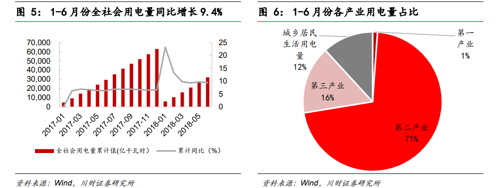 用電量方面:2018 年 1-6 月份,全國全社會用電量 32291 億千瓦時,同比增長 9.4%,增速比上年同期提高 3.1 個百分點;分產(chǎn)業(yè)看,1-6 月份,第一產(chǎn)業(yè)用電量 328 億千瓦時,同比增長 10.3%,對全社會用電量增長的貢獻率為 1.1%,占全社會用電量的比重為 1.0%;第二產(chǎn)業(yè)用電量 22336 億千瓦時,同比增長 7.6%,對全社會用電量增長的貢獻率為 56.5%,占全社會用電量的比重為 69.2%,對全社會用電量增長的貢獻率為 55.6%,占全社會用電量的比重為 72.8%;第三產(chǎn)業(yè)用電量 5071 億千瓦時,同比增長 14.7%,對全社會用電量增長的貢獻率為 23.4%,占全社會用電量的比重為 15.7%,;城鄉(xiāng)居民生活用電量 4555 億千瓦時,同比增長 13.2%,對全社會用電量增長的貢獻率為 19.0%,占全社會用電量的比重為 14.1%??傮w來看,全社會用電量累計增速同比提高,三產(chǎn)和城鄉(xiāng)居民用電快速增長;工業(yè)用電量較快增長,制造業(yè)日均用電量連續(xù)兩個月創(chuàng)歷史新高。