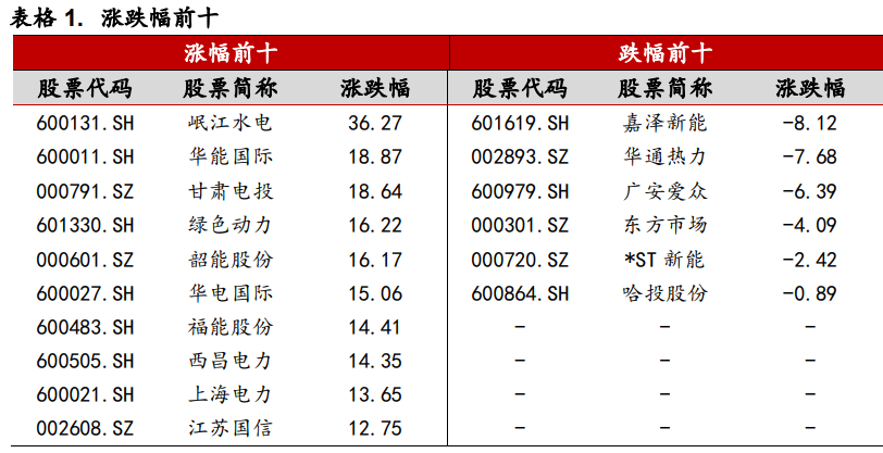個股方面,月漲幅居前的個股為岷江水電、華能國際、甘肅電投,漲幅分別為 36.27%、18.88%、18.64;月跌幅前三的個股為嘉澤新能、華通熱力、廣安愛眾,跌幅分別為 8.12%、7.68%、6.39%。
