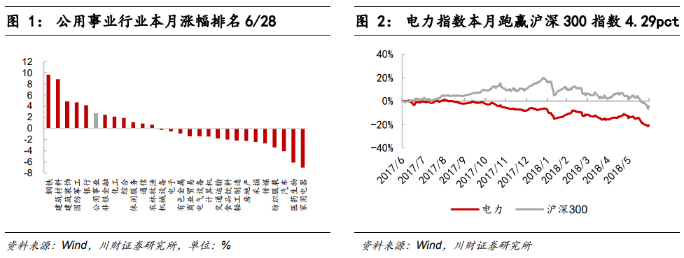 本月川財公用事業(yè)指數(shù)下跌 0.59%,滬深 300 指數(shù)上漲 0.19%,電力行業(yè)指數(shù)上漲 4.48%,電力行業(yè)指數(shù)跑贏滬深 300 指數(shù) 4.29 個百分點。個股方面,月漲幅居前的個股為岷江水電、華能國際、甘肅電投,漲幅分別為 36.27%、18.88%、 18.64;月跌幅前三的個股為嘉澤新能、華通熱力、廣安愛眾,跌幅分別為 8.12%、 7.68%、6.39%。
