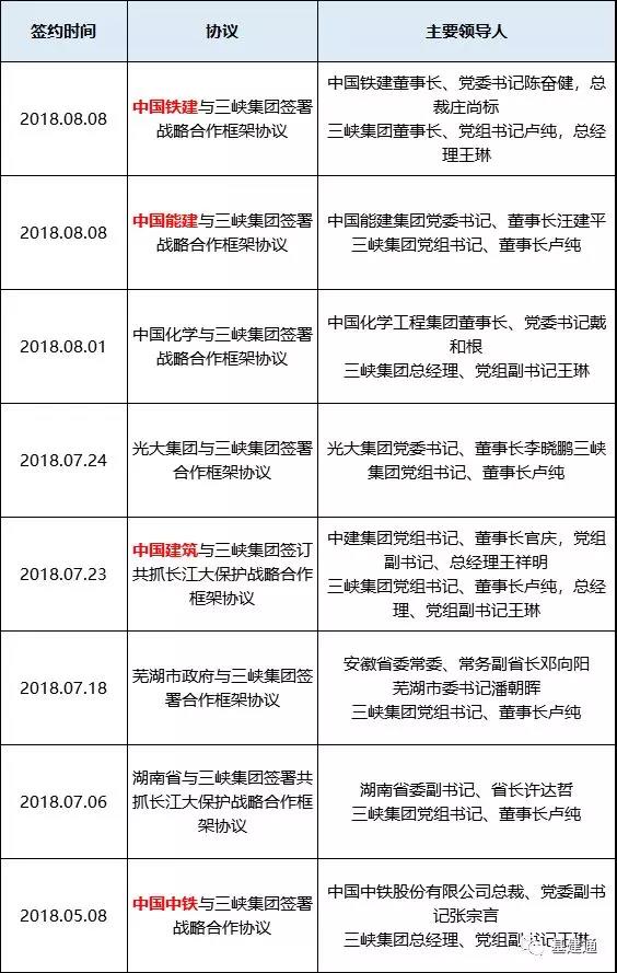 從7月到現(xiàn)在,僅一個(gè)月左右的時(shí)間里,三峽集團(tuán)就簽約了7份戰(zhàn)略合作框架協(xié)議,其中有3家建筑央企:中國建筑、中國鐵建、中國能建,加上此前與中國中鐵、中國電建簽署的合作協(xié)議,已經(jīng)有5家建筑央企巨頭和三峽集團(tuán)確定了合作。