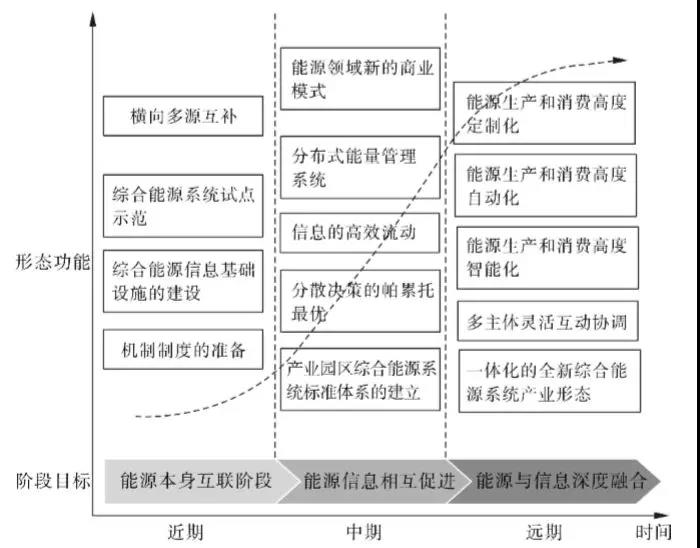 未來產(chǎn)業(yè)園區(qū)綜合能源系統(tǒng)將以互聯(lián)網(wǎng)深度應(yīng)用為基礎(chǔ),以電力系統(tǒng)為核心,將供氣系統(tǒng)、供熱系統(tǒng)與電力系統(tǒng)等集成,橫向角度實現(xiàn)電力、燃?xì)?、供熱等一體化多能互補(bǔ),縱向角度實現(xiàn)源網(wǎng)荷儲全環(huán)節(jié)高度協(xié)調(diào)與靈活互動、集中化與分布式相互結(jié)合的能源網(wǎng)絡(luò)。不論是單一的電力互聯(lián),還是能源領(lǐng)域演變產(chǎn)生的創(chuàng)新商業(yè)模式,亦或是互聯(lián)網(wǎng)思維與技術(shù)對能源工業(yè)的改造升級,都是多能互補(bǔ)綜合能源系統(tǒng)中的不同發(fā)展階段中的應(yīng)有要素。本質(zhì)上而言,產(chǎn)業(yè)園區(qū)綜合能源系統(tǒng)的發(fā)展是能源與信息不斷融合以及互相促進(jìn)的歷程,是一個漸進(jìn)的發(fā)展過程。綜合我國能源和信息基礎(chǔ)設(shè)施及能源市場等方面的現(xiàn)有條件,產(chǎn)業(yè)園區(qū)綜合能源系統(tǒng)演化路線圖如圖6所示。隨著時間推移,產(chǎn)業(yè)園區(qū)綜合能源系統(tǒng)大概可以分為近期、中期和遠(yuǎn)期3個發(fā)展階段。本質(zhì)上而言,這3個發(fā)展階段是一個同步發(fā)展、相互滲透和逐級遞進(jìn)的過程。3個階段的發(fā)展目標(biāo)和功能分別闡述如下。