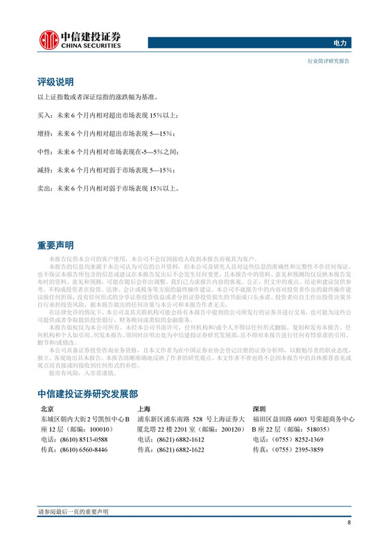 綜合而言,華電國際約有 852 萬千瓦裝機降價 1.1 分, 259.5 萬千瓦裝機降幅在 0.1 分至 0.5 分之間;華能國際約有 754 萬千瓦裝機降價 1.1 分, 444 萬千瓦裝機降幅在 0.004 分至 1 分之間。進一步考慮降價對于兩公司營收及業(yè)績的影響,我們假定利用小時為 4500 小時,同時考慮山東統(tǒng)調機組計劃電量占發(fā)電量 53%( 18 年上半年數(shù)據(jù),假定 47%的市場電不受電價調整影響),結合上市公司對相關電廠的權益占比,測算結果如表 3 所示。 根據(jù)測算結果顯示,在相關假設下,華電國際和華能國際年化歸母凈利潤影響分別為-1.20 億和-1.26 億。考慮到此次降價政策自今年 9 月 1 日起執(zhí)行, 華電國際和華能國際 18 年歸母凈利受損分別為-4000 萬元和-4200萬元。