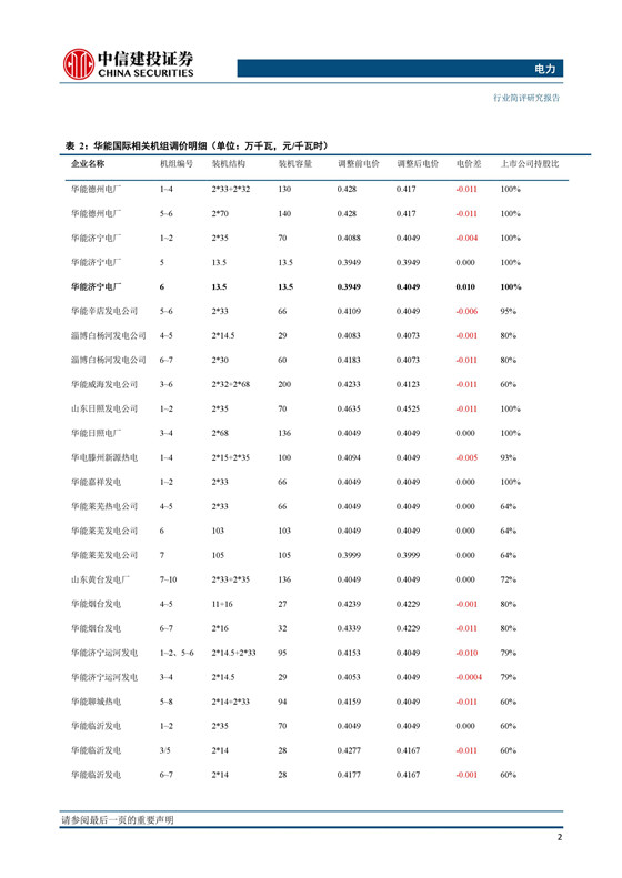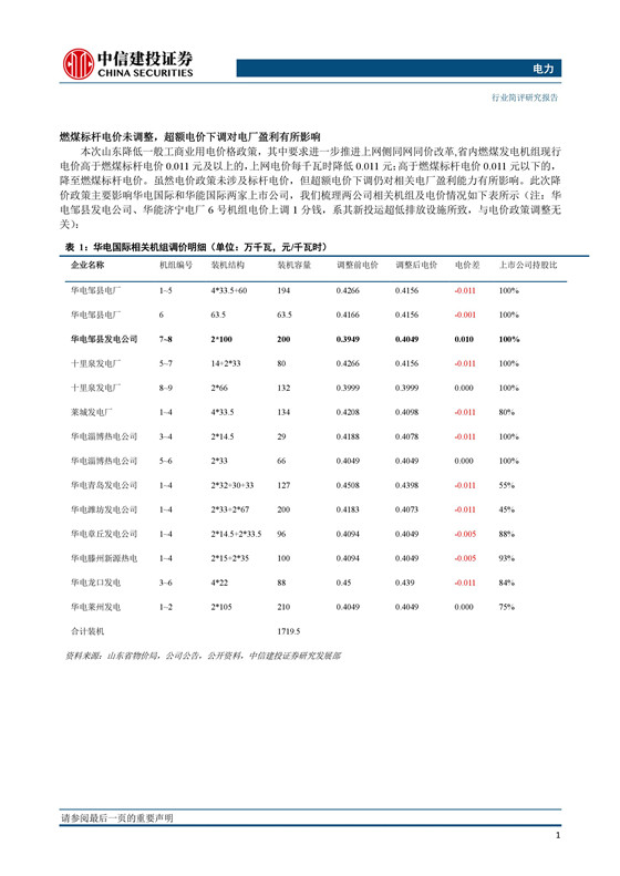 本次山東降低一般工商業(yè)用電價格政策,其中要求進一步推進上網(wǎng)側同網(wǎng)同價改革,省內(nèi)燃煤發(fā)電機組現(xiàn)行電價高于燃煤標桿電價 0.011 元及以上的,上網(wǎng)電價每千瓦時降低 0.011 元;高于燃煤標桿電價 0.011 元以下的,降至燃煤標桿電價。 雖然電價政策未涉及標桿電價,但超額電價下調仍對相關電廠盈利能力有所影響。此次降價政策主要影響華電國際和華能國際兩家上市公司,我們梳理兩公司相關機組及電價情況如下表所示(注:華電鄒縣發(fā)電公司、華能濟寧電廠 6 號機組電價上調 1 分錢,系其新投運超低排放設施所致,與電價政策調整無關):