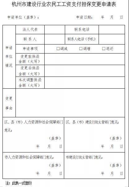 第十九條 保證金或支付擔(dān)保繳存額度調(diào)整的施工企業(yè),應(yīng)在接到建設(shè)行政主管部門或人力資源和社會(huì)保障行政主管部門通知之日起15日內(nèi),填寫《杭州市建設(shè)行業(yè)農(nóng)民工工資保證金變更申請(qǐng)表》(詳見附件9)或《杭州市建設(shè)行業(yè)農(nóng)民工工資支付擔(dān)保變更申請(qǐng)表》(詳見附件10)(以下簡(jiǎn)稱《變更申請(qǐng)表》)向相應(yīng)的建設(shè)行政主管部門提出變更申請(qǐng),經(jīng)核簽后于15日內(nèi)持《變更申請(qǐng)表》到保證金開戶銀行或擔(dān)保管理部門辦理變更手續(xù)。變更結(jié)束后,持原《繳存卡》或擔(dān)保受理憑證到保證金管理部門(擔(dān)保管理部門)辦理《繳存卡》或擔(dān)保受理憑證的變更登記手續(xù)。