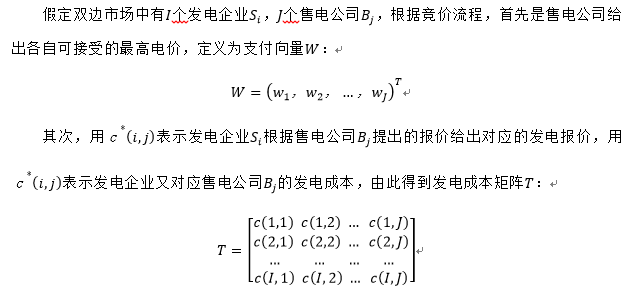首先,在分析售電公司報(bào)價(jià)策略之前,需要對(duì)競(jìng)價(jià)機(jī)制有所規(guī)定,在合同交易市場(chǎng)中的多對(duì)多雙邊交易模式下,不同于集中交易的地方主要在于這里的多對(duì)多是建立在一對(duì)一成交的基礎(chǔ)上,即一家發(fā)電企業(yè)只能與一家售電公司進(jìn)行匹配,而集中交易下的多對(duì)多是可以一家發(fā)電企業(yè)與多家售電公司進(jìn)行匹配的。
