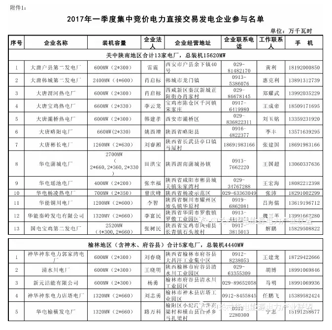 附件1:參加2017年一季度陜西省集中競(jìng)價(jià)直接交易發(fā)電企業(yè)名單