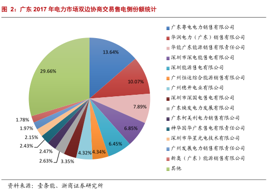 2017年交易共有60家發(fā)電企業(yè)、82家售電公司、6家電力用戶參與,其中售電公司總成交電量為815億度,占的雙邊協(xié)商交易規(guī)模的94%,成交量前7名售電公司均為首批公示售電公司,分別為:廣東粵電電力銷售公司、華潤電力(廣東)銷售公司、華能廣東能源銷售公司、深電能售電公司、深圳能源售電公司、恒運綜合能源銷售公司、穗開電業(yè),它們大多在發(fā)電資源與客戶資源方面具有明顯優(yōu)勢,合計市場份額53.6%,如圖2所示。