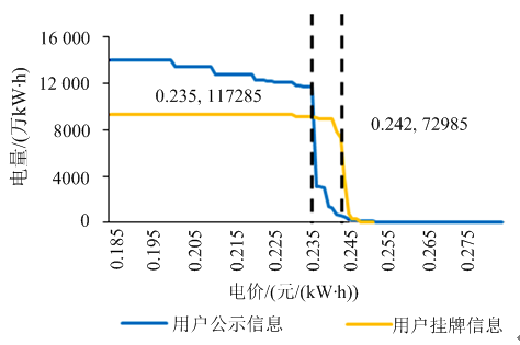 最后進(jìn)入到用戶掛牌、電廠摘牌環(huán)節(jié)。用戶掛牌電量9.32億kW•h,均價0.242元/(kW•h),較公示價格提高0.009元/(kW•h)。用戶掛牌的需求曲線