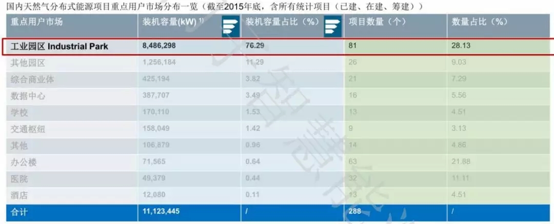 以燃?xì)夥植际侥茉错椖繛槔?,在工業(yè)園區(qū)、商業(yè)綜合體、數(shù)據(jù)中心、學(xué)校等市場中,工業(yè)園區(qū)中分布式能源項目的裝機容量、項目數(shù)量占比都是最大的。