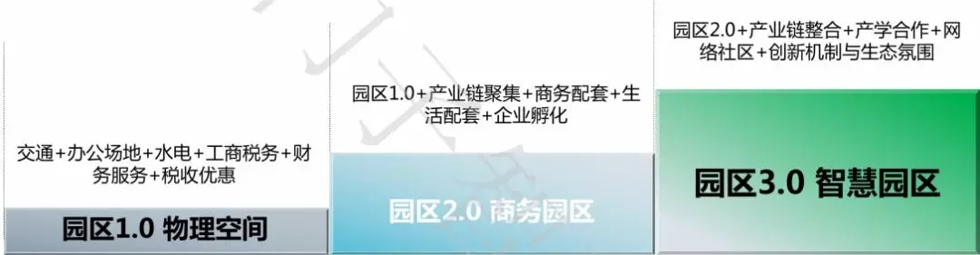 園區(qū)2.0:在1.0的基礎(chǔ)上聚集產(chǎn)業(yè)鏈、提供配套服務(wù),目前很多園區(qū)都處于2.0階段