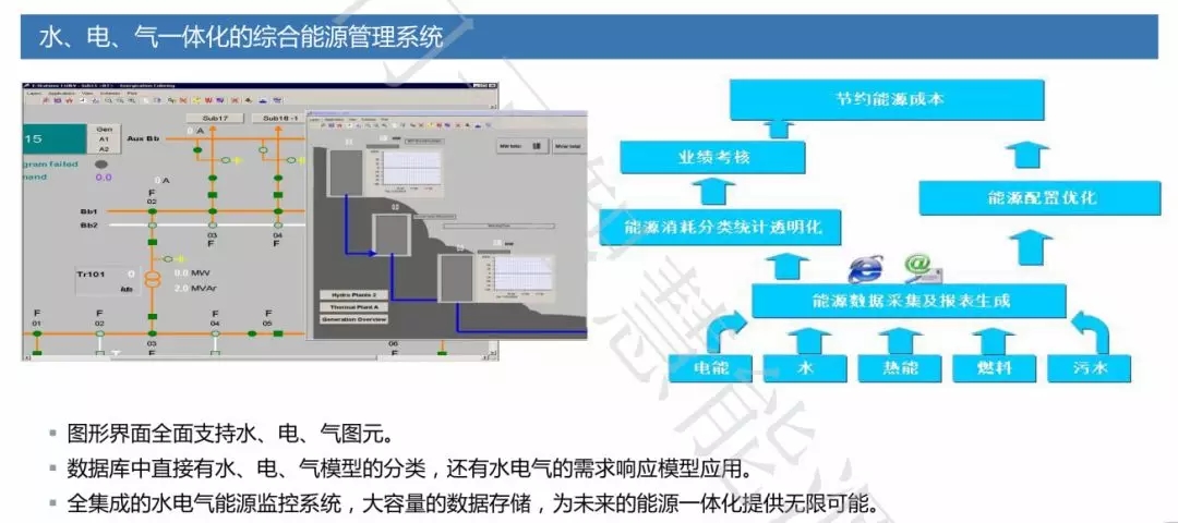 全集成的公用事業(yè)的能源管理監(jiān)控平臺:從SCADA角度來講,可以把水電氣熱以及蒸汽進(jìn)行一個系統(tǒng)的管理,為未來能源一體化提供了技術(shù)平臺