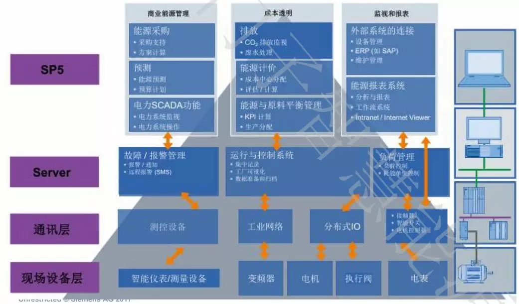 系統(tǒng)層:商業(yè)能源管理(能源采購、預(yù)測、電力SCADA功能)、能源與原料平衡管理、監(jiān)視和報表