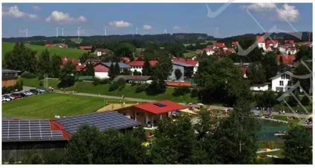 為達(dá)成2050年能源改革所實施的明星級示范項目,利用屋頂光伏、風(fēng)力發(fā)電、沼氣發(fā)電、冷熱電三聯(lián)供和電動汽車等,可再生能源發(fā)電量可達(dá)小鎮(zhèn)2500人口需求的300%以上。