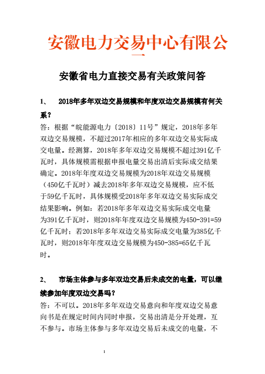 安徽電力交易中心日前發(fā)布《安徽省電力直接交易有關(guān)政策問答》,指出:經(jīng)測算,2018年多年雙邊交易規(guī)模不超過391億千瓦時。2018年年度雙邊