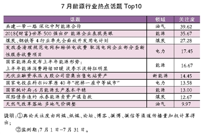 人民網(wǎng)輿情數(shù)據(jù)中心通過梳理7月能源行業(yè)十大話題、能源領(lǐng)域精彩言論、熱門能源企業(yè)以及新近出臺的能源行業(yè)新規(guī)新政,解讀當(dāng)前能源輿情熱點(diǎn)。