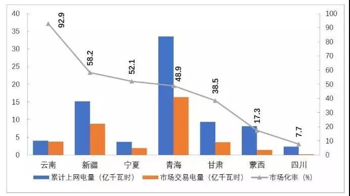 風電市場化率居前幾位的省份依序為:云南(67.5%)、黑龍江(49.6%)、新疆(46.6%)、寧夏(45.5%)、甘肅(45.2%)。