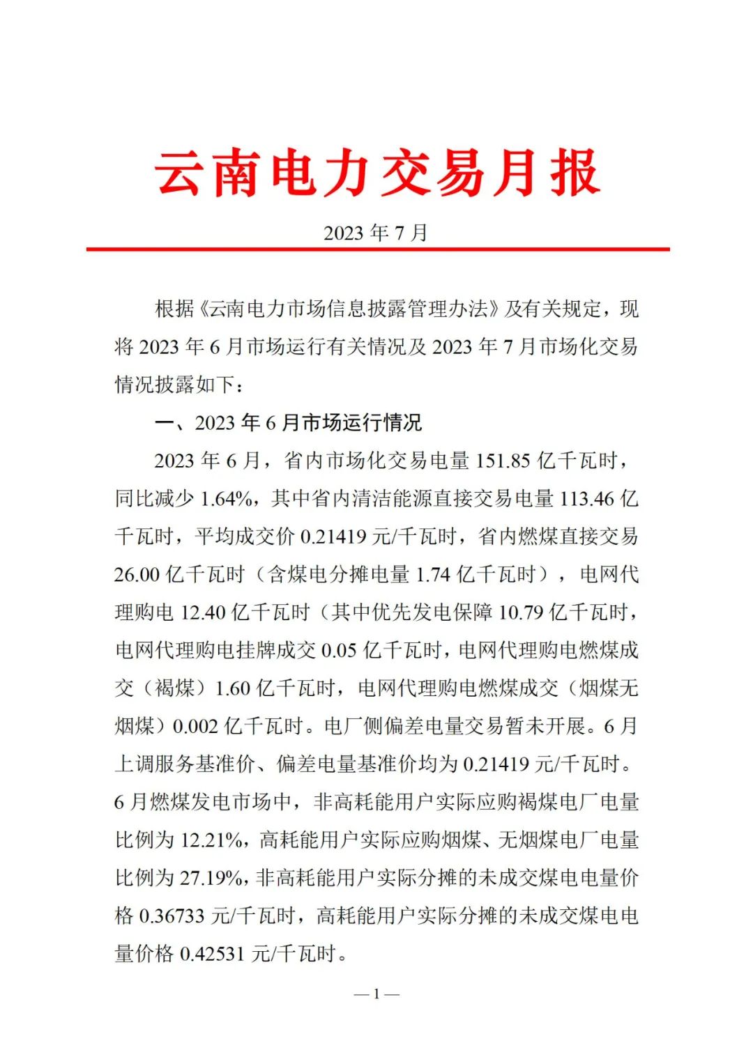 云南電力交易月報(bào)(2023年7月)