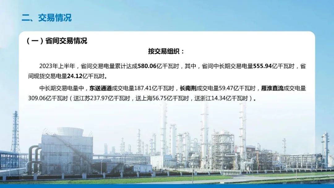 2023年上半年,省間交易電量累計達成580.06億千瓦時,其中,省間中長期交易電量555.94億千瓦時,省間現(xiàn)貨交易電量24.12億千瓦時。