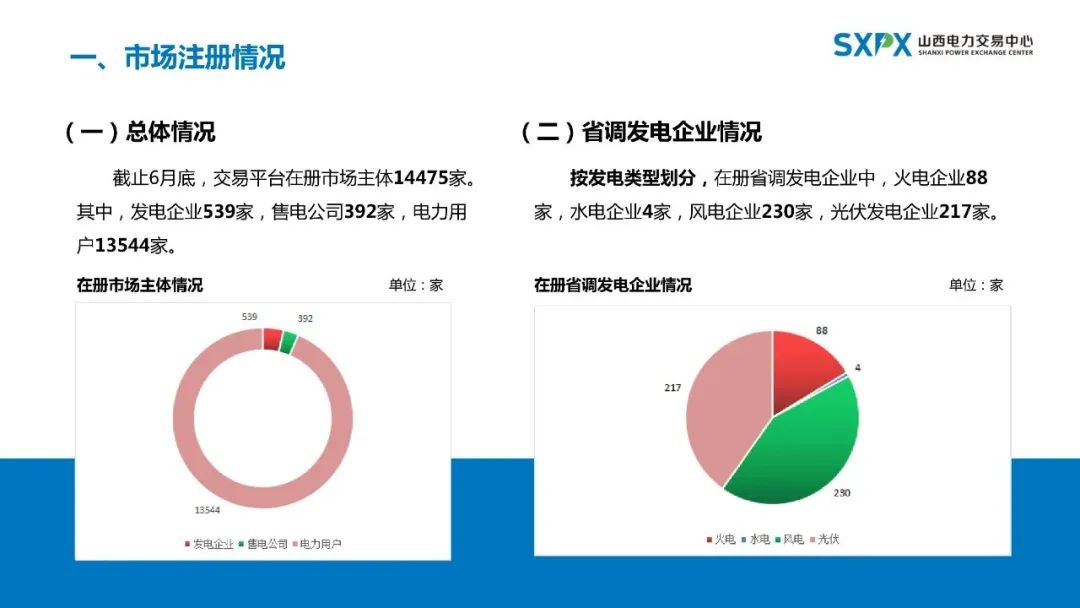截止6月底交易平臺在冊市場主體14475家其中,發(fā)電企業(yè)539家,售電公司392家,電力用戶13544家。