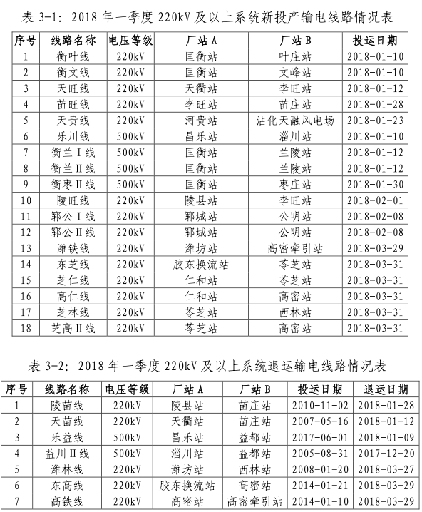 表 2-1: 2018 年一季度 220kV 及以上系統(tǒng)新投產(chǎn)變電設(shè)備情況表