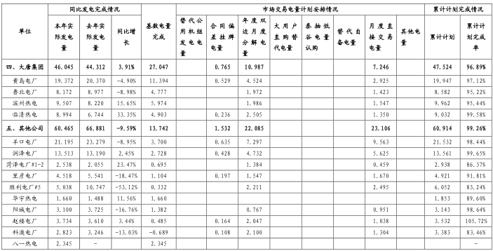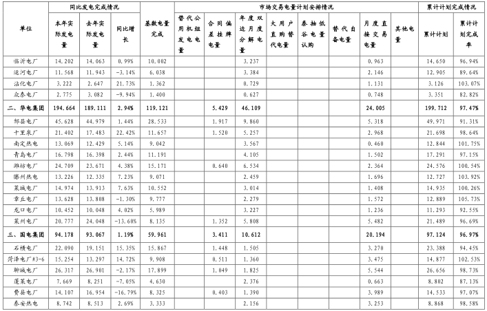 章丘電廠(計劃完成率 105.73%)、趙樓電廠(計劃完成率 105.72%)、滕州熱電(計劃完成率 103.92%)、沾化電廠(計劃完成率 103.07%)、煙臺電廠(計劃完成率 102.75%)、南定熱電(計劃完成率 101.75%)、濰坊電廠(計劃完成率 100.54%)、華德電廠(計劃完成率 100.33%)、萊州電廠(計劃完成率 100.26%)。