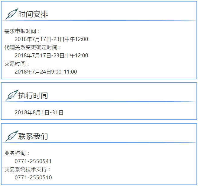 售電公司:在交易中心完成注冊,列入廣西售電公司目錄的售電公司。需求申報時間:2018年7月17日-23日中午12:00;代理關(guān)系變更確定時間:2018年7月17日-23日中午12:00;交易時間:2018年7月24日9:00-11:00。詳情如下: