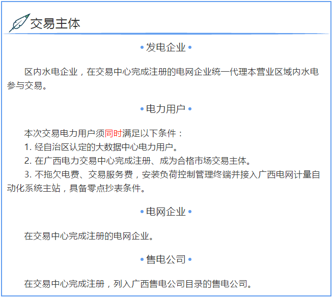 廣西電力交易中心發(fā)布的《關(guān)于開展2018年8月大數(shù)據(jù)中心用電市場化交易的通知》文件,發(fā)電企業(yè):區(qū)內(nèi)水電企業(yè),在交易中心完成注冊的電網(wǎng)企業(yè)統(tǒng)一代理本營業(yè)區(qū)域內(nèi)水電參與交易。