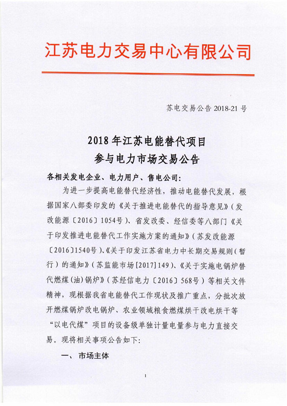 江蘇電力交易中心日前發(fā)布了《2018年江蘇電能替代項目參與電力市場交易公告》,分批次放開燃煤鍋爐改電鍋爐、農(nóng)業(yè)領域糧食燃煤烘干改電烘干等“以電代煤”項目的設備級單獨計量電量參與電力直接交易。