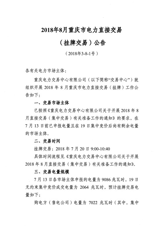 重慶電力交易中心日前發(fā)布了《2018年8月重慶市電力直接交易(掛牌交易)工作公告》,預(yù)計(jì)掛牌交易電量如下:購(gòu)電方(售電公司)電量為7022兆瓦...