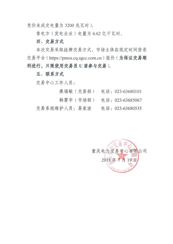 重慶2018年8月掛牌交易20日開(kāi)展: 售電方(發(fā)電企業(yè))電量為6.62億千瓦時(shí)