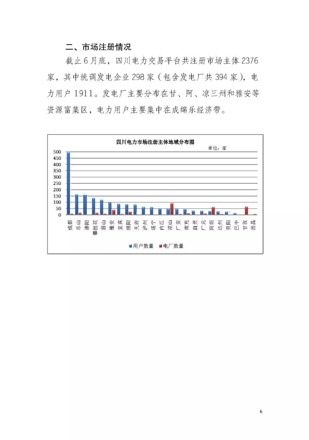 市場(chǎng)注冊(cè)情況:截止6月底四川電力交易平臺(tái)共注冊(cè)市場(chǎng)主體2376家,其中統(tǒng)調(diào)發(fā)電企業(yè)298家(包含發(fā)電廠共394家),電力用戶1911家。發(fā)電廠主要分有在甘、阿、涼三州和雅安等資源富集區(qū),電力用戶主要集中在成綿樂(lè)經(jīng)濟(jì)帶。
