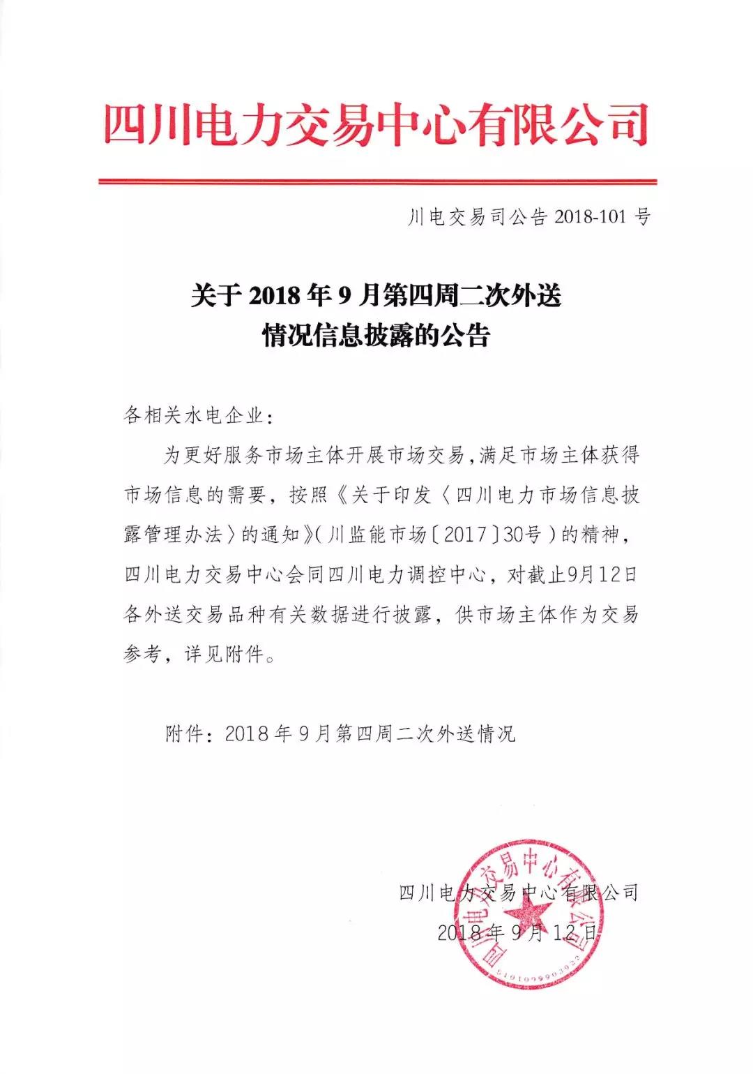 公告 | 四川關(guān)于2018年9月第四周二次外送情況信息披露的公告