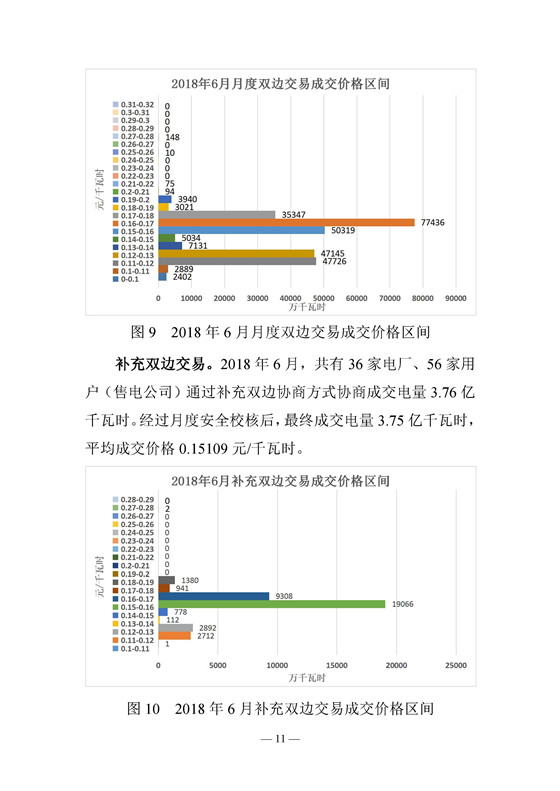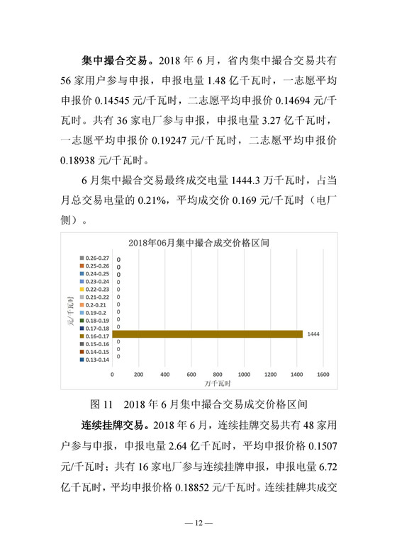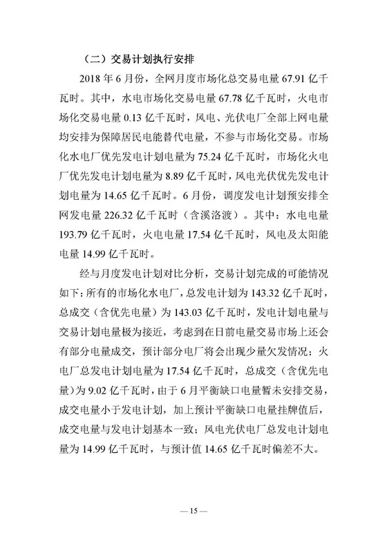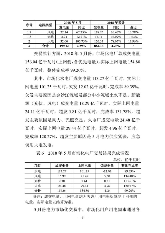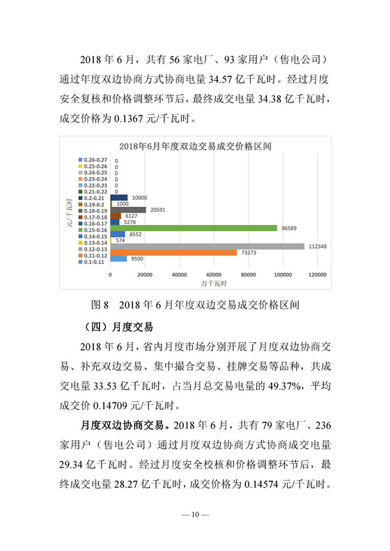2018年6月,省內市場共成交電量67.91億千瓦時,同比增長19.03%,年度、月度交易電量比例為50.63%、49.37%,平均成交價0.14183元/千瓦時。