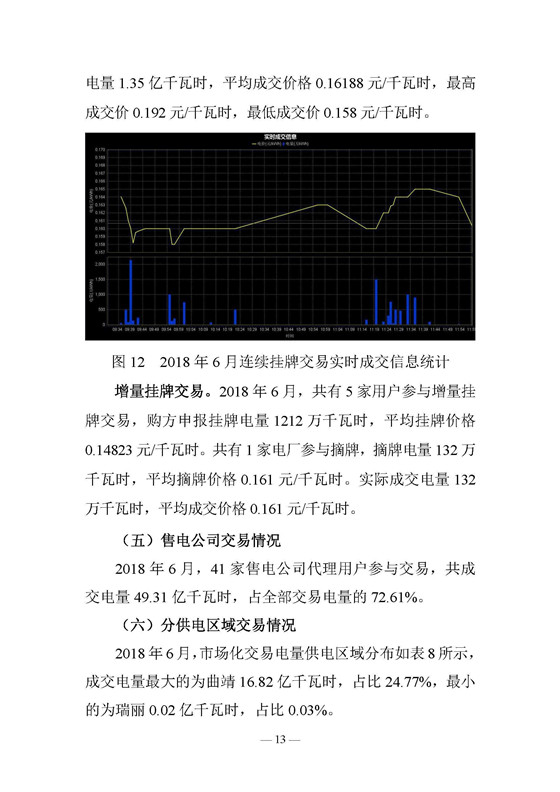 2018年6月,41家售電公司代理用戶參與交易,共成交電量49.31億千瓦時,占全部交易電量的72.61%。