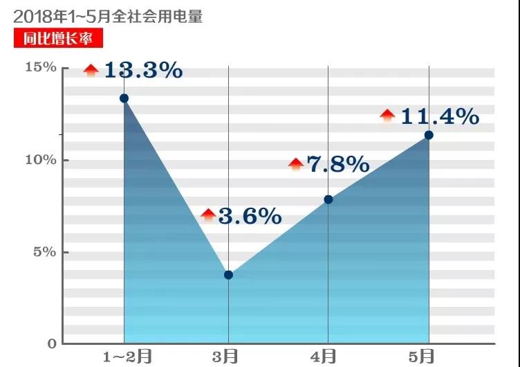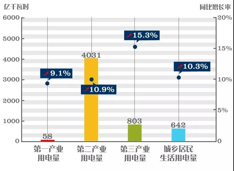 5月份,全社會用電量5534億千瓦時,同比增長11.4%。分產(chǎn)業(yè)看,第一產(chǎn)業(yè)用電量58億千瓦時,同比增長9.1%;第二產(chǎn)業(yè)用電量4031億千瓦時,同比增長10.9%;第三產(chǎn)業(yè)用電量803億千瓦時,同比增長15.3%;城鄉(xiāng)居民生活用電量642億千瓦時,同比增長10.3%。