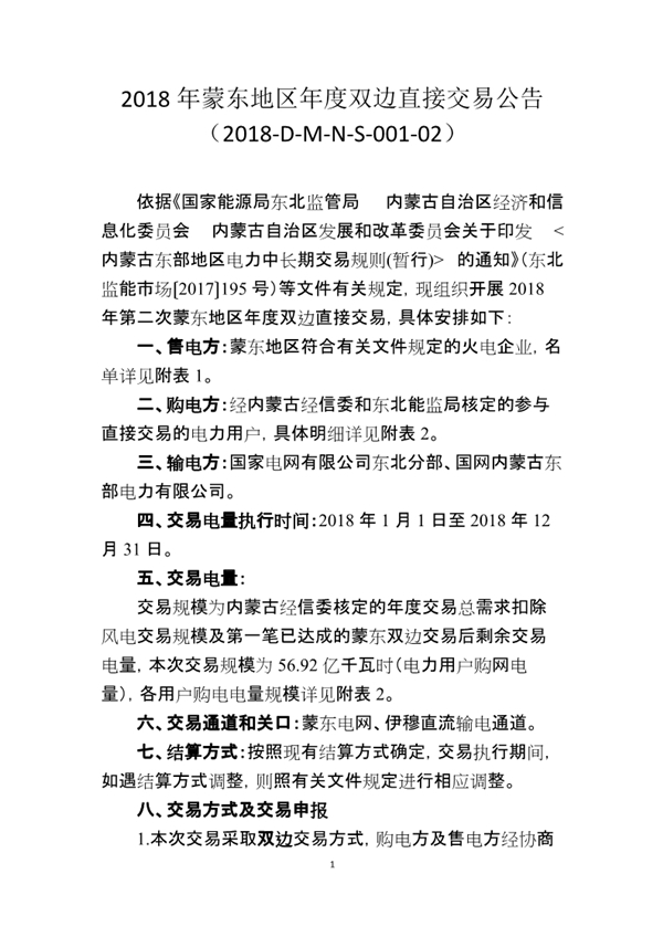 北京電力交易中心日前發(fā)布了《2018年蒙東地區(qū)年度雙邊直接交易公告》,現(xiàn)組織開展2018年第二次蒙東地區(qū)年度雙邊直接交易。交易電量:交易規(guī)