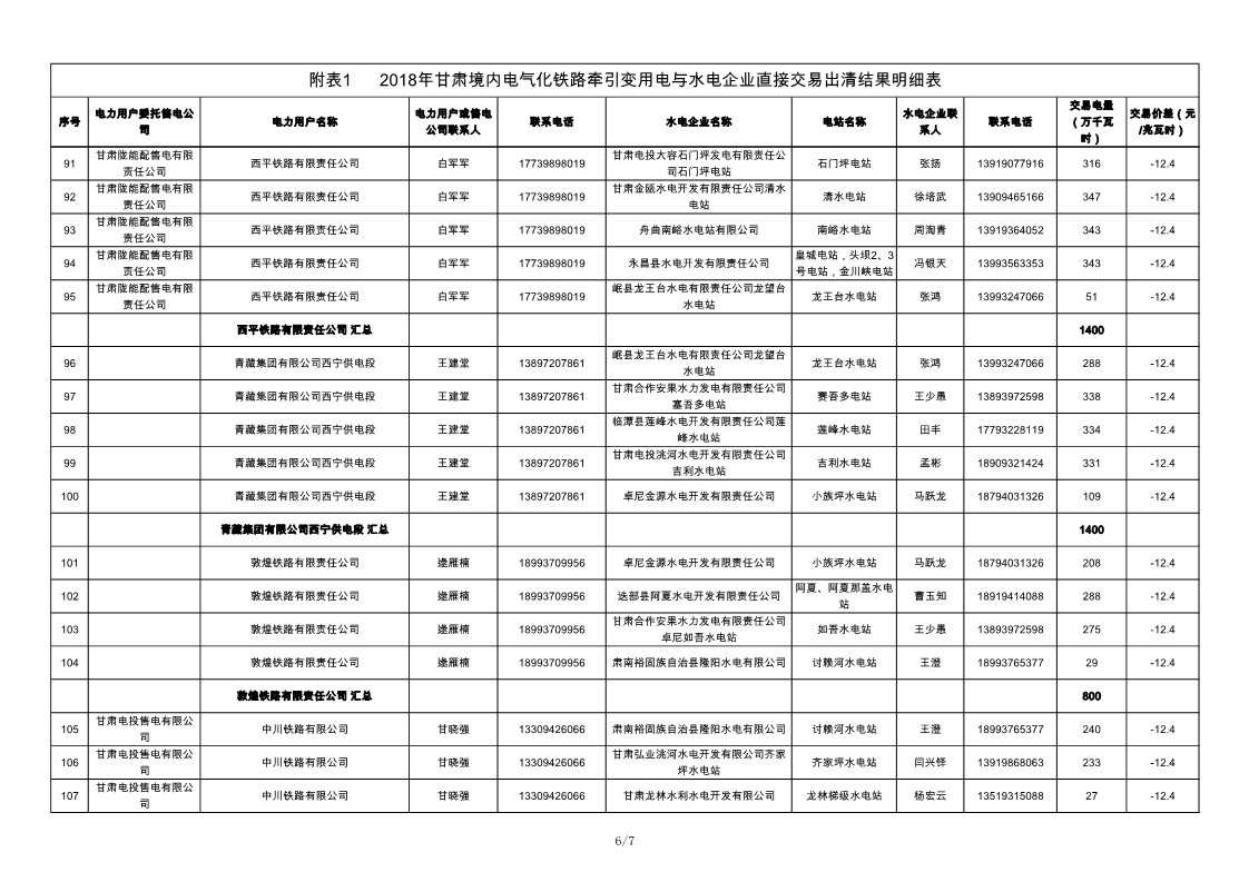 2018年甘肅境內(nèi)電氣化鐵路牽引變用電與水電企業(yè)直接交易結(jié)果