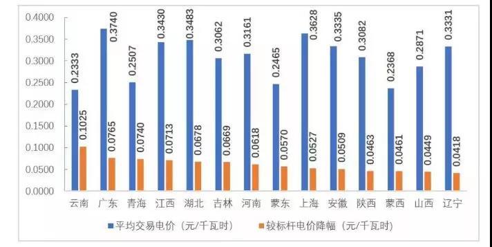 從分省煤電交易價格來看,與標桿電價比較降幅最大的是云南,其市場交易平均電價為0.2333元/千瓦時,與標桿電價相比降幅0.1025元/千瓦時,其次為廣東、青海、江西,其交易平均電價分別為0.3740元/千瓦時、0.2507元/千瓦時、0.3430元/千瓦時,降幅均超過0.07元/千瓦時。