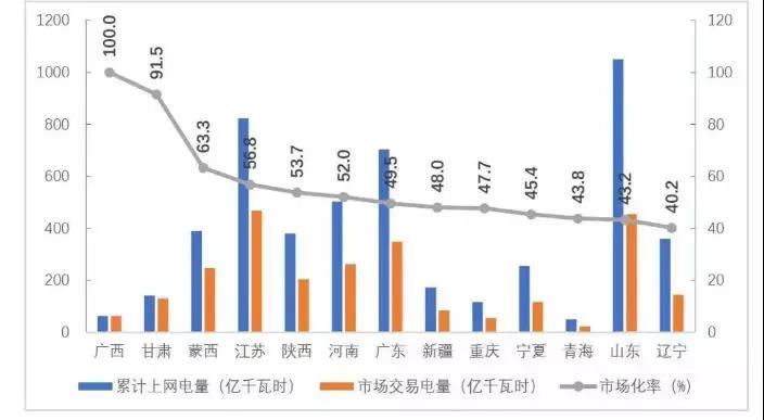 分省來看,市場交易電量占全社會用電量比重排序前三名的省份是云南、蒙西和江蘇,分別為49.4%、46.1%、44.5%;電力市場交易電量規(guī)模排序前三名的省份分別為江蘇1286億千瓦時、山東768億千瓦時、廣東599億千瓦時;外受電市場交易電量排序前三名的省份分別是江蘇286億千瓦時、山東242億千瓦時和浙江160億千瓦時。