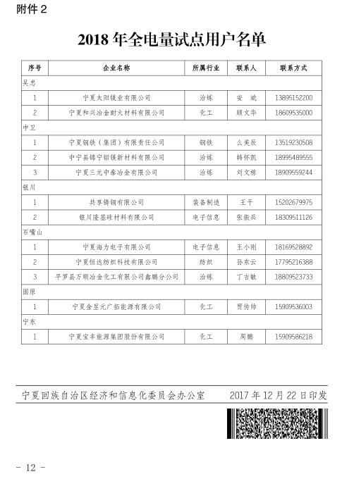 寧夏2018年161家電力直接交易準(zhǔn)入用戶和12家全電量試點用戶名單