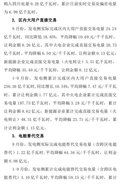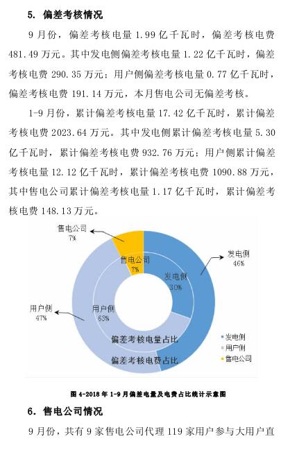 9月份,偏差考核電量1 99億千瓦時(shí),偏差考核電費(fèi)481 49萬元。其中發(fā)電側(cè)偏差考核電量1 22億千瓦時(shí),偏差考核電費(fèi)290 35萬元;用戶側(cè)偏差考核電量0 77億千瓦時(shí),偏差考核電費(fèi)191 14萬元,本月售電公司無偏差考核。